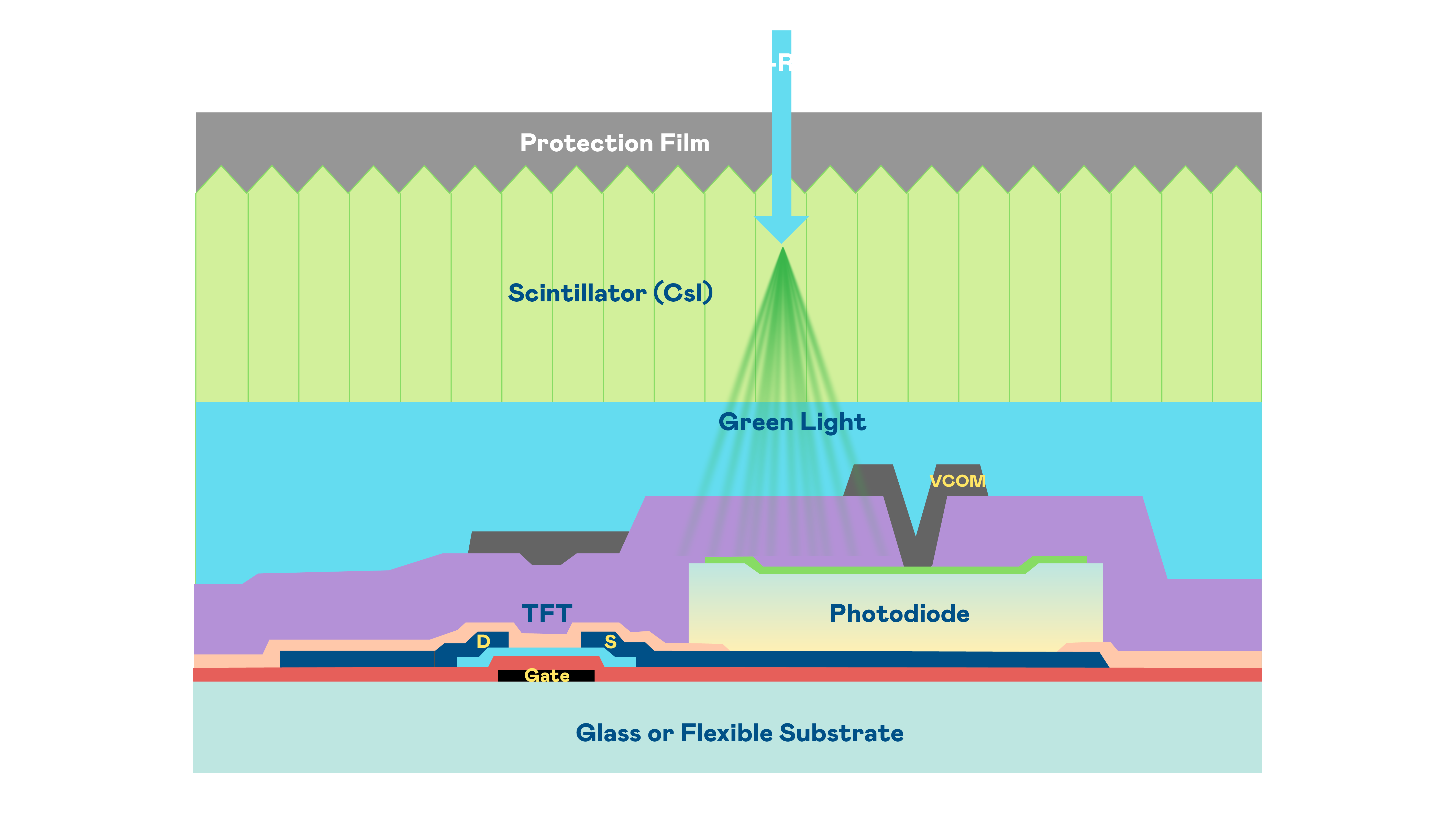 广东会的X光影像感测阵列使用薄膜电晶体 (TFT) 作为每个像素的读取开关,搭配光电二极体(Photodiode)的光电转换元件,用以感测X光影像讯号。